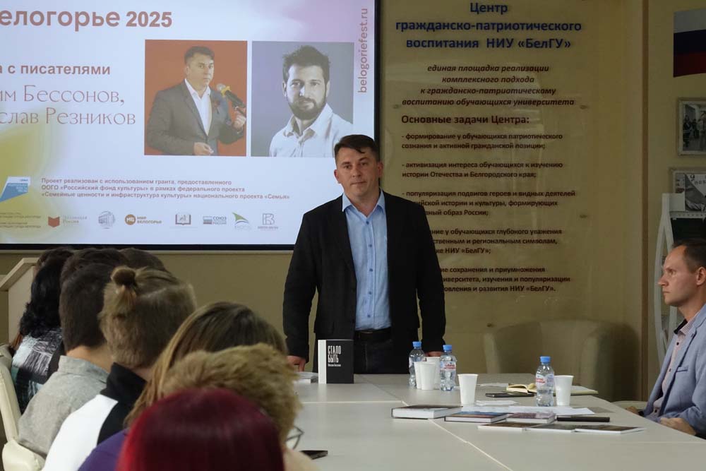 В Центре гражданско-патриотического воспитания обучающихся НИУ «БелГУ» состоялась встреча с белгородскими поэтами и прозаиками, организатором которой выступила Научная библиотека им. Н.Н. Страхова. Студентам юридического и экономического институтов прозаик Владислав Резников рассказал о своём творческом пути. По собственному признанию, начинал со стихов, но этот опыт оказался неудачным в отличие от написания рассказов. Первый из них вышел на страницах газеты «Наш Белгород» 25 лет назад.