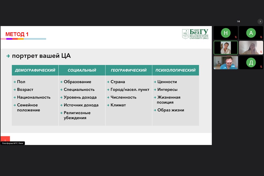 О важности анализа целевой аудитории и необходимости учитывать психотип покупателя студентам рассказали приглашённые эксперты – наставник проектов по развитию предпринимательской деятельности «Новые Возможности», «Ты в Деле, Я в Деле» Оксана Яковенко, бизнес-ассистент руководителя Дарья Фёдорова и организатор и руководитель корпуса трекеров в вузовских акселераторах, руководитель проектов трансформации бизнеса Валентина Ананьева.