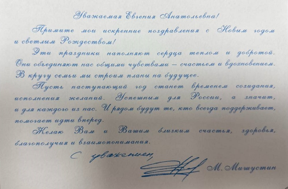 Председатель Правительства Российской Федерации Михаил Мишустин прислал в адрес ректора НИУ «БелГУ» Евгении Карловской поздравление с Новым годом и Рождеством.