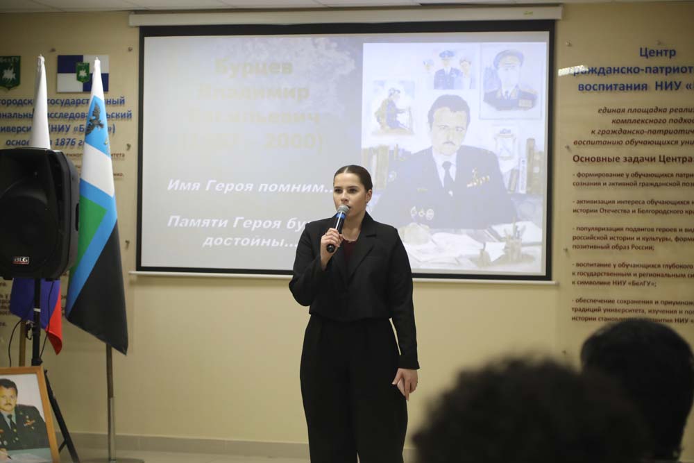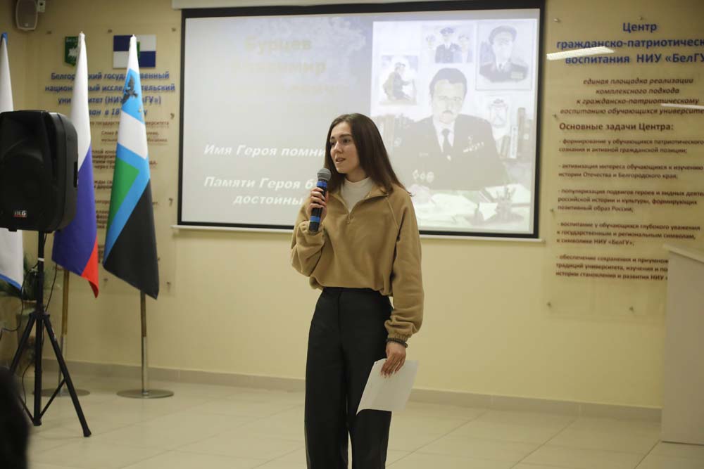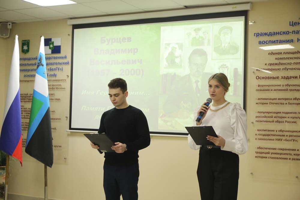 Вечер памяти Героя Российской Федерации Владимира Бурцева объединил в Центре гражданско-патриотического воспитания обучающихся студентов всех институтов и колледжей НИУ «БелГУ». Почётным гостем встречи стала вдова Героя Ирина Бурцева.
