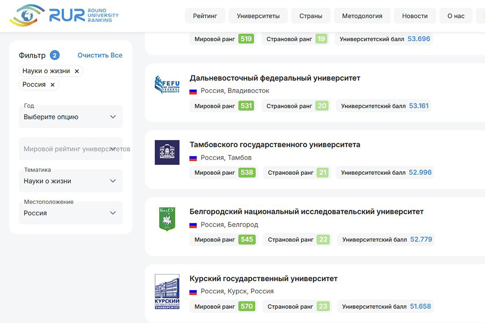 – по Наукам о жизни – 545 место из 912 вузов мира и 22 место из 71 вуза РФ;