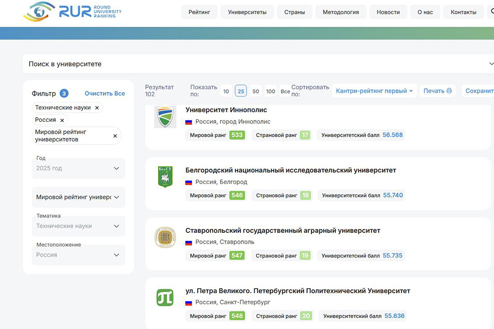 – по Техническим наукам – 546 место из 1064 вузов мира и 18 место из 102 вузов РФ;