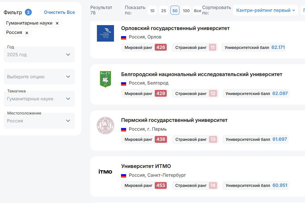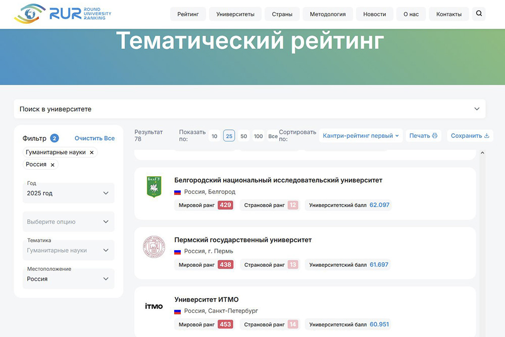 – по Гуманитарным наукам – 429 место из 905 вузов мира и 12 место из 78 российских университетов;