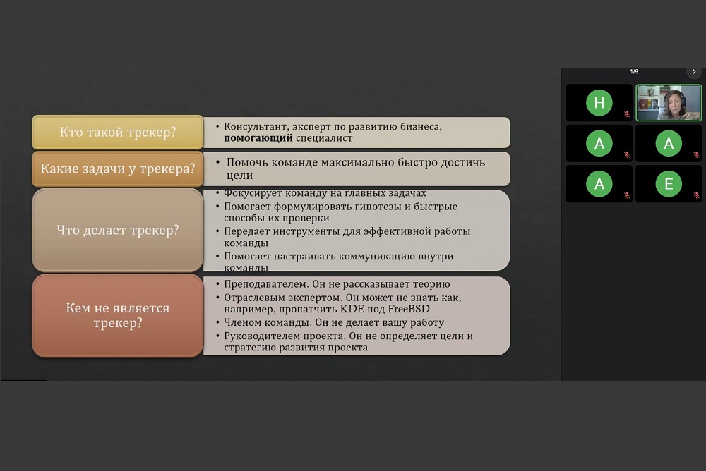 Организатор и руководитель корпуса трекеров в вузовских акселераторах, руководитель проектов трансформации бизнеса Валентина Ананьева подготовила участников акселератора к работе с трекером – специалистом-наставником, который помогает команде стартапа проходить программу. Она пояснила, что наставники будут помогать стартаперам на протяжении всей программы акселератора, а также проведут несколько совместных встреч, чтобы обсудить все вопросы.