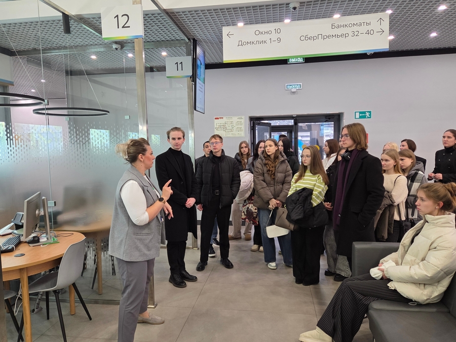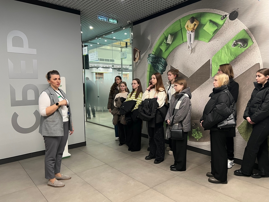 Экскурсия началась с посещения операционного зала - сердца ежедневной клиентской работы. Начальник управления прямых продаж Белгородского отделения №8592 Сосницкая Алена Васильевна показала студентам, как организованы основные процессы обслуживания, как взаимодействуют сотрудники разных направлений и какие технологии используются для обеспечения скорости и качества операций.