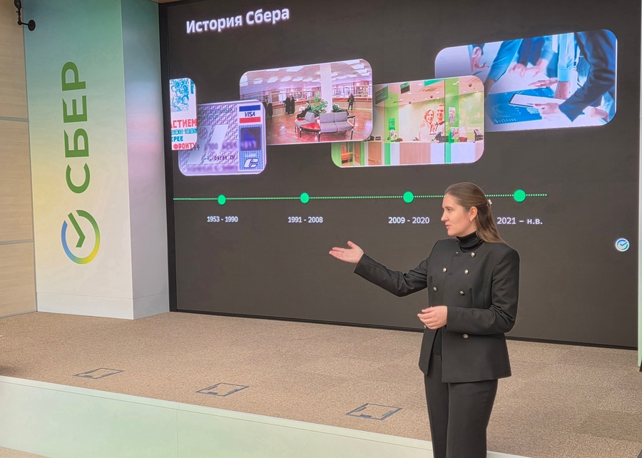Затем студентам был показан фильм об истории Сбера - от первых шагов к становлению до превращения в многофункциональную экосистему, объединяющую финансовые, сервисные и цифровые решения. После просмотра экскурсия продолжилась знакомством с широким спектром подразделений, от маркетинга и менеджмента до отделов, работающих с малым и средним бизнесом, крупными корпоративными клиентами и государственными учреждениями.