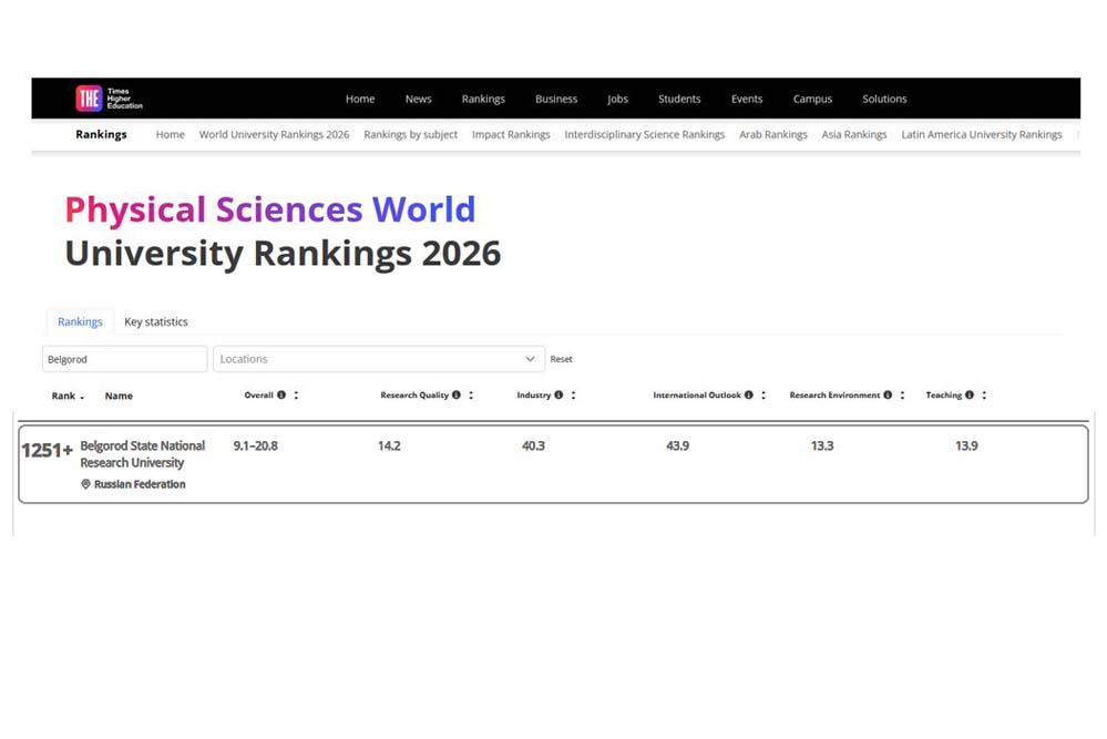 В рейтинге по Физическим наукам (Physical Sciences) НИУ «БелГУ» представлен в группе 1251+ из 1497 вузов мира и в группе 30-52 из 52 вузов в российском сегменте.